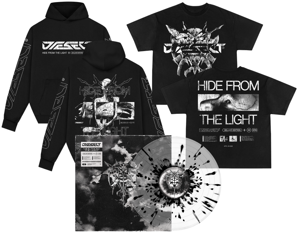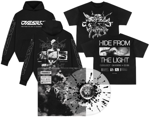 Bundle contains a hoodie Printed on Gildan Hammer 360gsm Heavyweight Blend Blank, t-shirt printed on AS Heavy Minus blank and the deluxe edition of Diesect's Hide From The Light pressed on clear w/ black splatter vinyl.