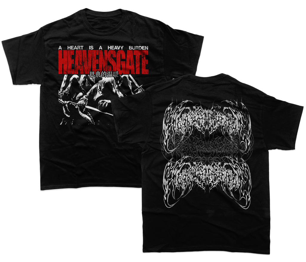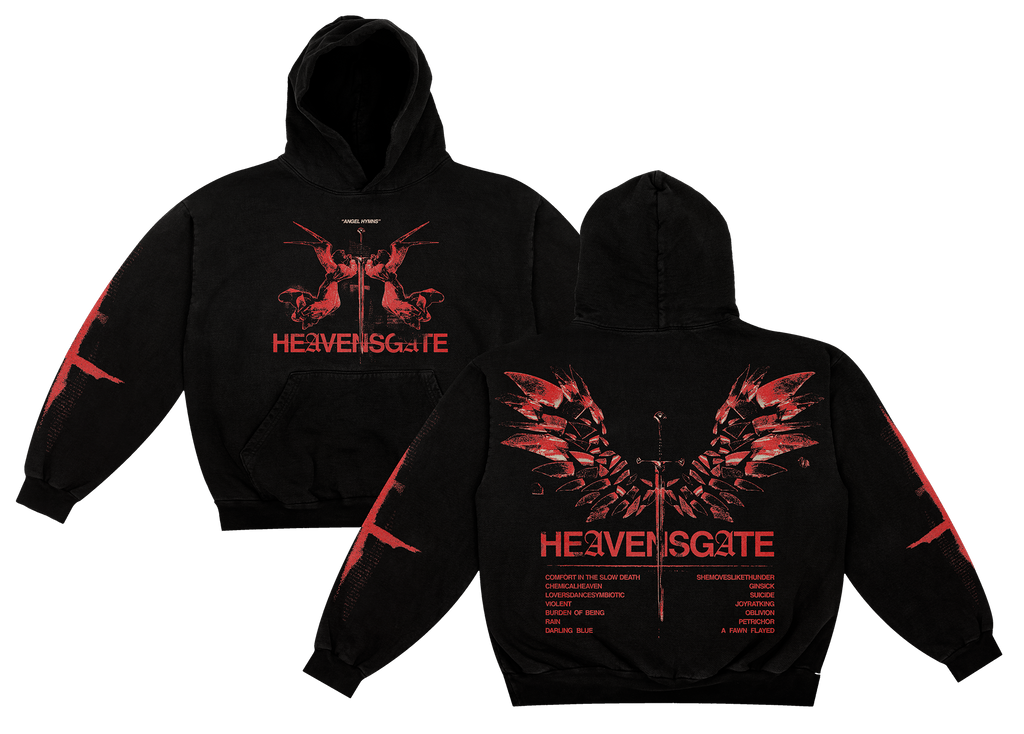 This bundle contains a Cherry Red Eco Mix copy of HEAVENSGATE'S debut LP release ANGEL HYMNS, as well as an 'ANGEL HYMNS' hoodie printed on Gildan Heavyweight and an 'A HEART IS A HEAVY BURDEN' tee printed on Gildan Heavy